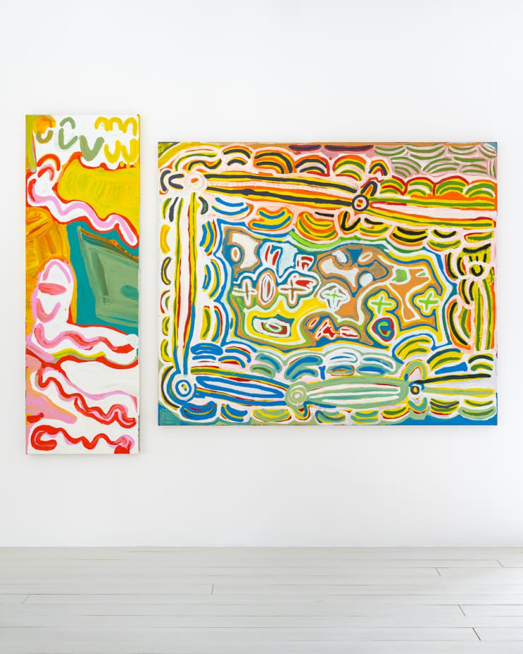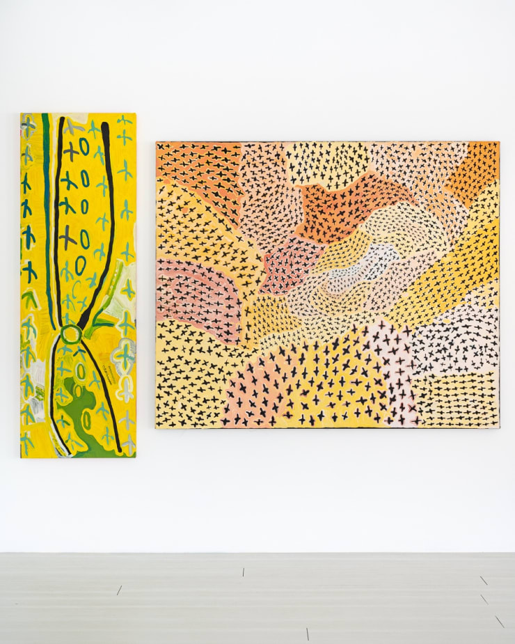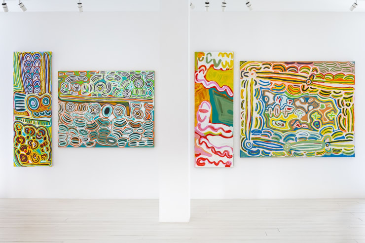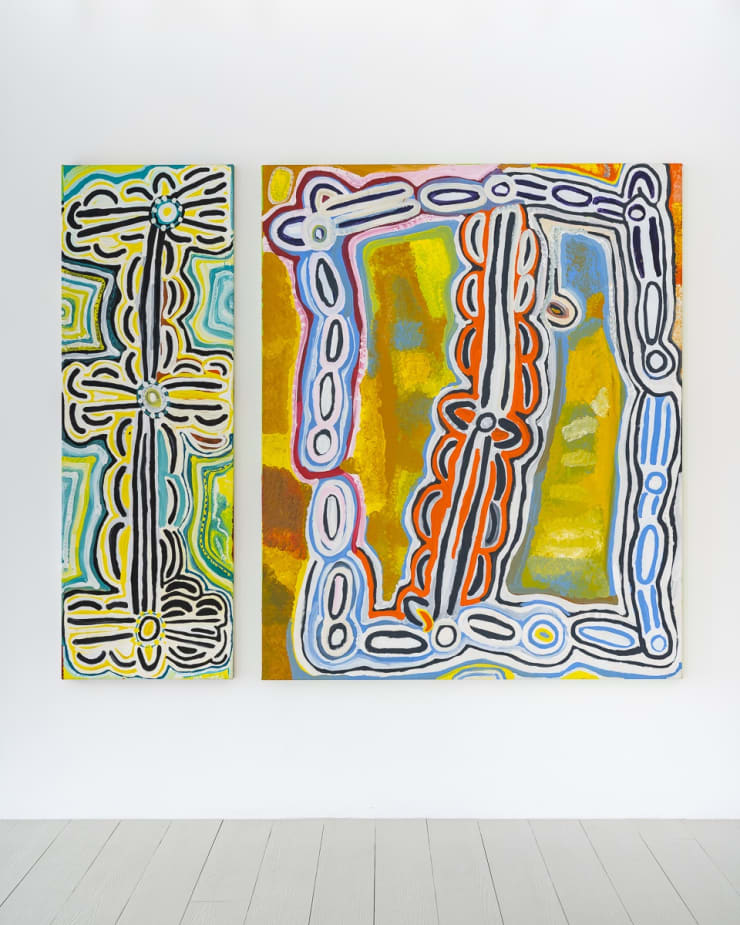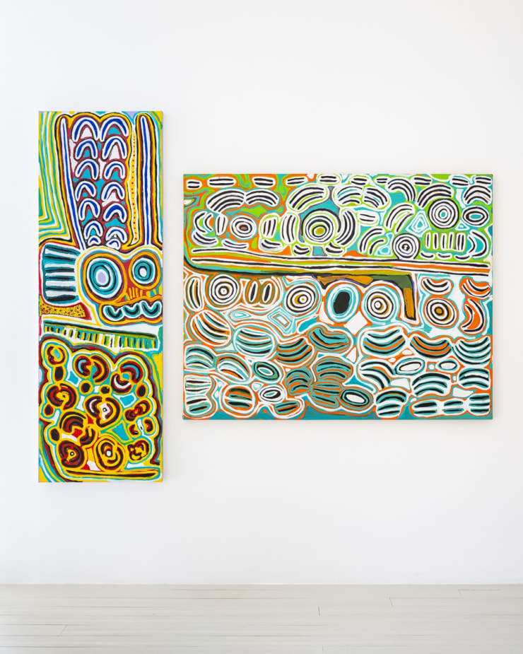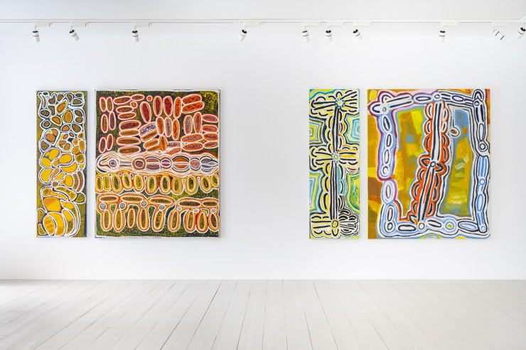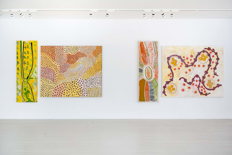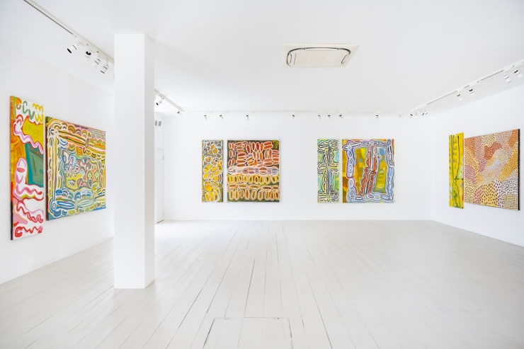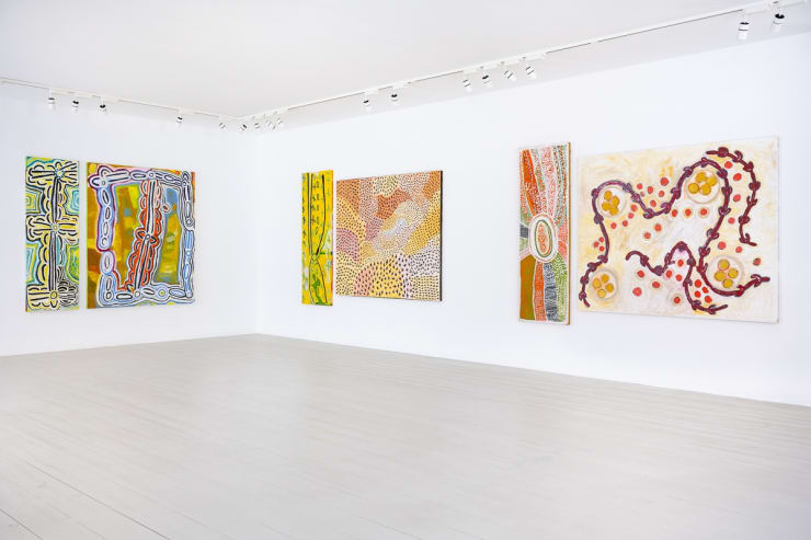 JGM Gallery presents 24 paintings, all vibrant acrylics on linen or canvas, by seven Aboriginal artists from the Warlpiri people in Australia's central desert region - some of the most celebrated Aboriginal artists in Australia's Northern Territory. The artists, all women, created their works at the Indigenous-owned art centre in the Lajamanu community, on the edge of the Tanami Desert, halfway between Alice Springs and Darwin.