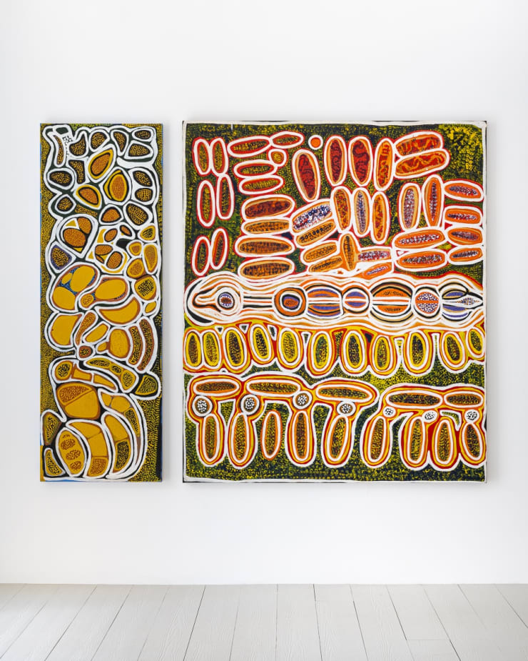 The Dreamings featured in the works that make up the Colour From the Australian Desert exhibition depict stories about animals (from flocks of budgerigars to the black-headed python), seeds and plants (used for food and medicinal purposes) and the ceremonies performed by the Warlpiri women. Everything relates to Country.